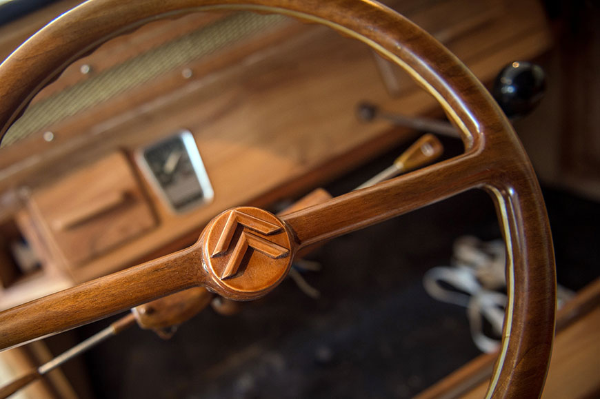 Pentru această operă de artă au fost necesare mai multe tipuri de lemn: păr pentru cadru, măr pentru capotă, nuc pentru aripi și volan, cireș pentru uși și ulm pentru tabloul de bord.