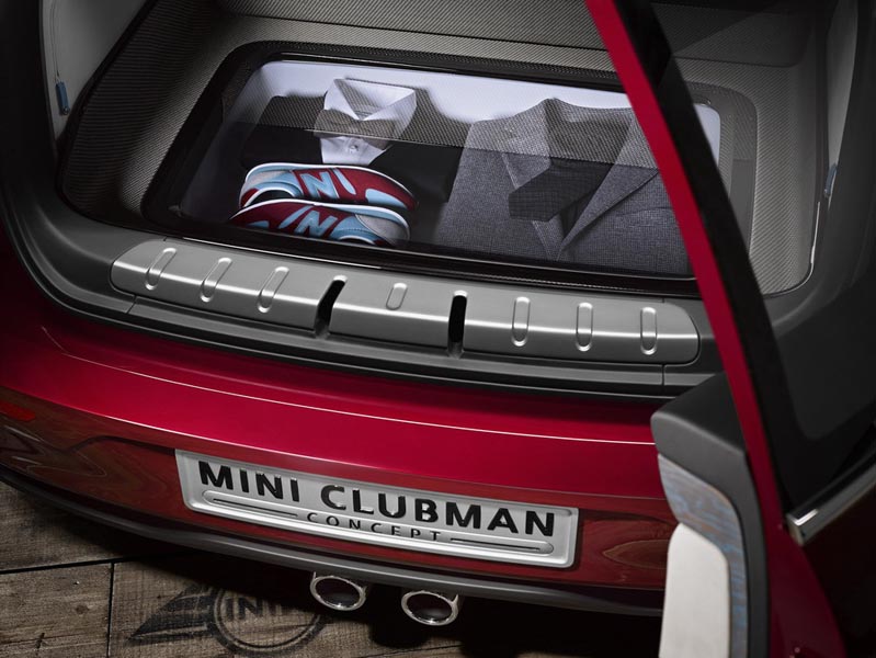 Mini Clubman Concept este lat şi atletic atunci când este privit din spate. Dispunerea în cascadă specifică Mini - o combinaţie de mai multe straturi - oferă automobilului o poziţie solidă şi o orientare puternică a roţilor când este văzut din spate. Cel mai atractiv element al spatelui îl reprezintă uşile divizate caracteristice. Cadrul continuu al uşilor nu mai este realizat din panouri metalice. Grafica uşilor oferă rama care înconjoară întreaga secţiune spate asemenea unei paranteze discrete. Acest design nou elaborat oferă întregului spate o apariţie modernă şi minimalistă. Stopurile poziţionate orizontal se bucură de o finisare foarte detaliată. Forma acestora subliniază apariţia lată a automobilului şi orientarea dinamică a secţiunii spate. Accentele cromate alese - precum inscripţia „Clubman”, emblema Mini pe uşa din stânga şi mânerele uşilor - sunt detalii care accentuează aspiraţia spre înaltă calitate a Mini Clubman Concept.
