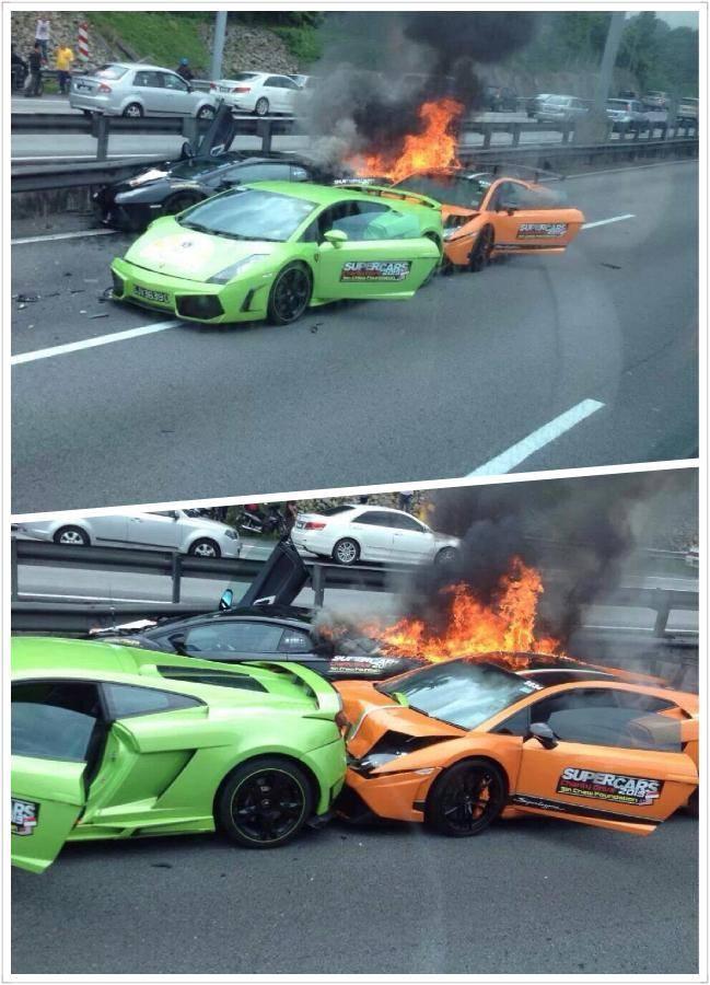 Două modele Lamborghini Gallardo şi un Lamborghini Aventador au ars pe o autostradă din Malaesia. Conform primelor date, convoiul de Lamborghini se îndrepta spre un eveniment caritabil când un alt şofer a intrat în plin în acesta. Din cauza impactului, modelul Gallardo Superleggera de culoare portocalie a lovit din spate celălalt Gallardo de culoare verde, în timp ce Aventador-ul a fost proiectat în bariera de protecţie care separă cele două sensuri ale autostrăzii. Din imagini se observă că focul a izbucnit în spatele Aventador-ului şi s-a extins apoi şi la celelalte două maşini. În ciuda faptului că bolizii au fost complet distruşi, nicio persoană nu a fost rănită în accident.