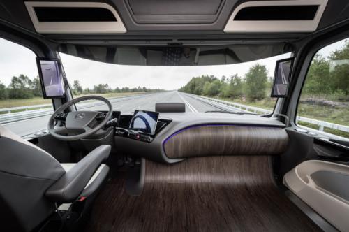 Si interiorul cabinei este construit dupa un design cu un aspect ordonat combinat cu materiale naturale, pentru a crea un mediu relaxant. Conducand în mod autonom, șoferul poate întinde scaunul lui și până cu 45 de grade pentru a adopta o poziție mai confortabil în timp ce poate controla camionul si cu o tableta detașabila.