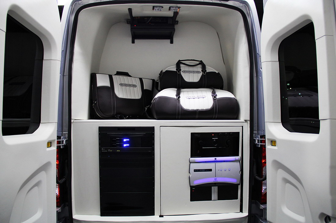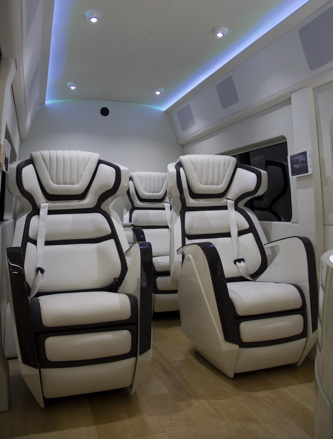 Transformarea radicală s-a produs la interior, acolo unde spaţiul nu mai are nimic în comun cu o dubă. Patru scaune tip „tron” concepute special pentru această maşină, podea din lemn, iluminat ambiental, un ecran gigant de 52 de inch sau un sistem audio ultra-performant promit să transforme orice călătorie într-o experienţă unică. Un bar şi un sistem prin satelit pentru recepţionarea canalelor tv completează experienţa.
