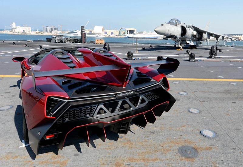 O maşină „nebună” cum este noul Lamborghini Veneno Roadster putea fi lansată oficial doar într-o locaţie cu totul inedită pentru o companie auto. Şi Lamborghini a reuşit să facă asta, prezentând lumii întregi noul Veneno decapotabil pe puntea unui portavion italian, ancorat portul Mina Zayed din Abu Dhabi. Decizia s-a dovedit a fi una inspirată, design-ul unic al modelului integrându-se perfect în peisaj, alături de avioanele de luptă.